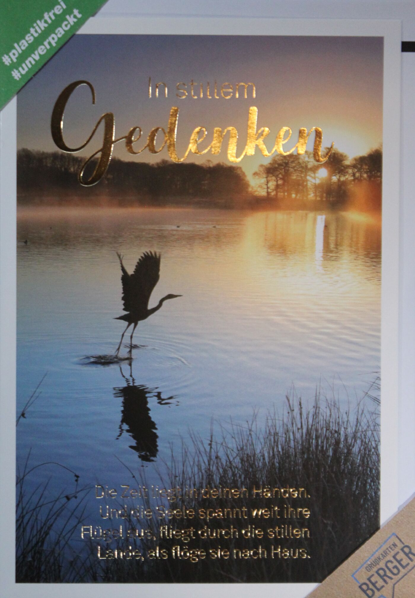 Hochwertige Trauerkarte die durch eine goldfarbige Heißprägefolie veredelt wurde.