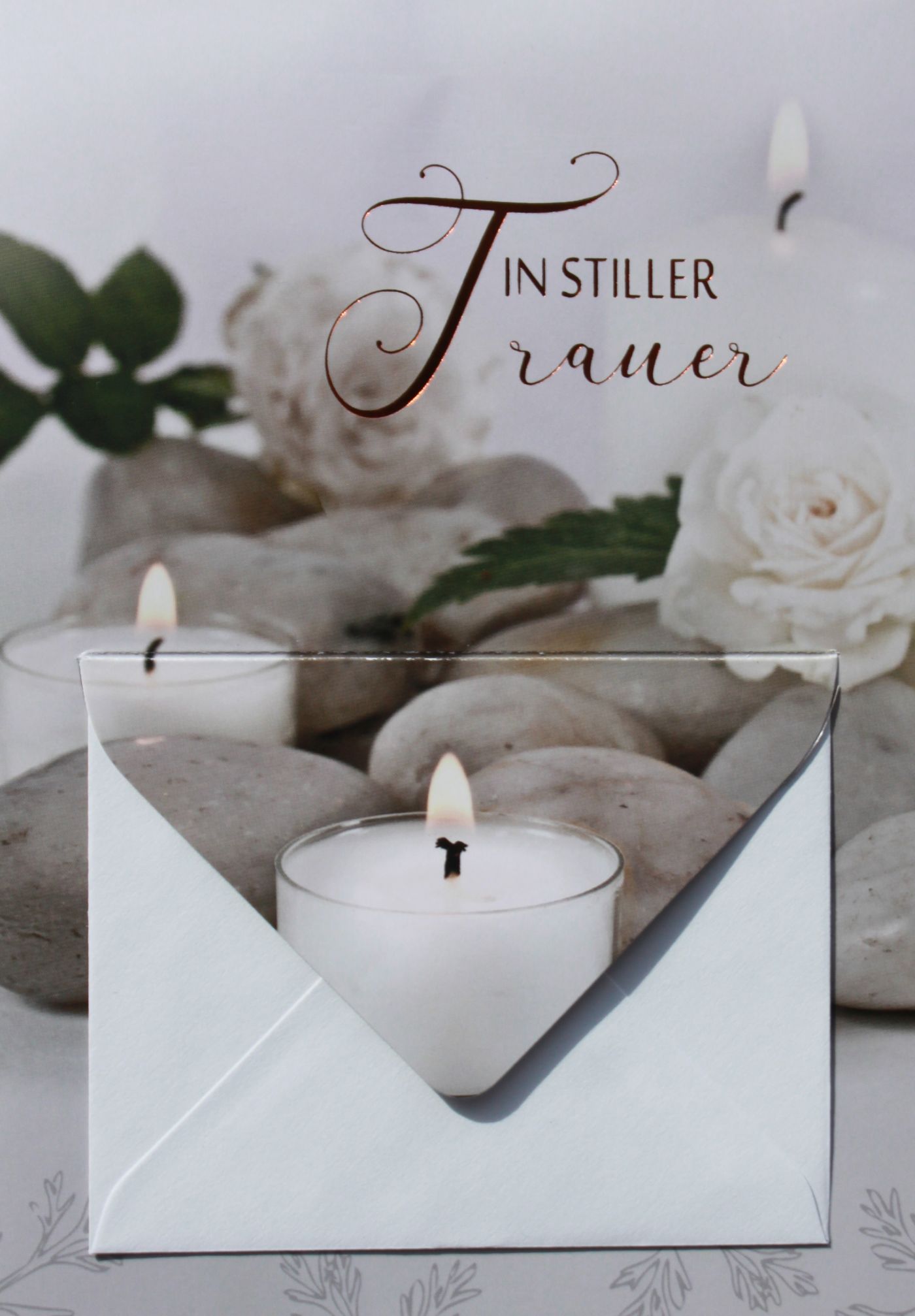 Hochwertige Trauerkarte die durch eine kupferfarbige Heißprägefolie veredelt wurde.
