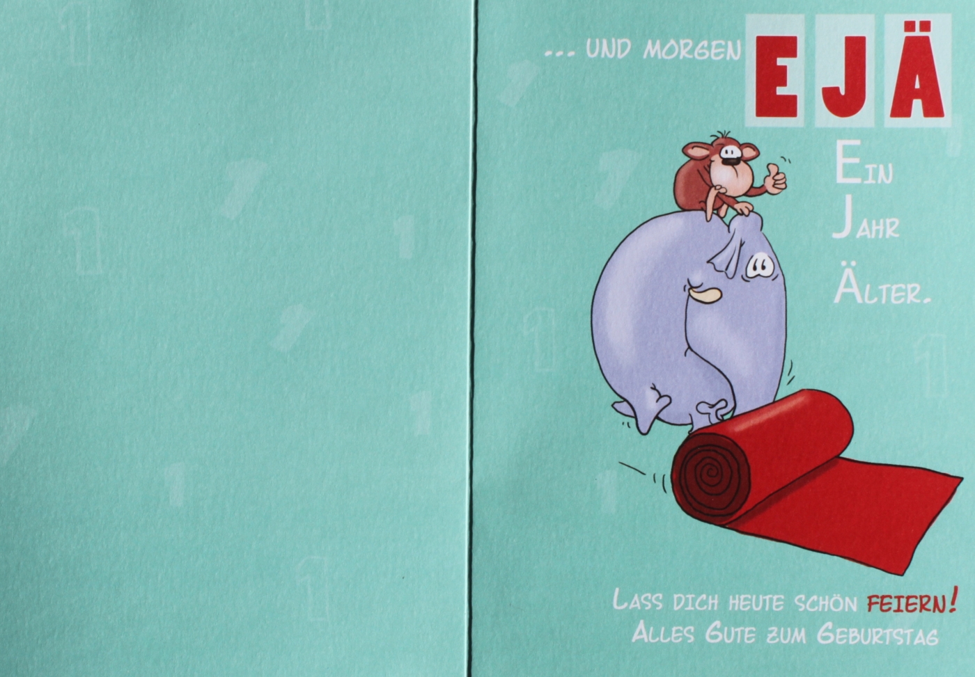 Hochwertige Karte zum Geburtstag mit lustigen Humorsprüchen auf der Kartenoberseite und Innenseite (siehe Bild 2).