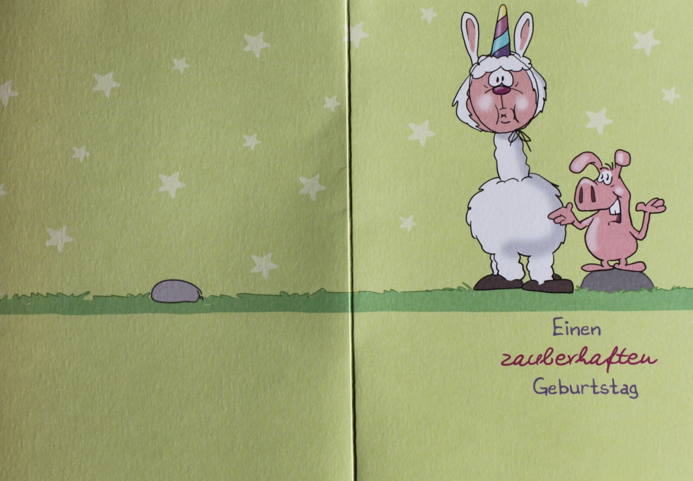 Hochwertige Karte zum Geburtstag mit lustigen Humorsprüchen auf der Kartenoberseite und Innenseite (siehe Bild 2).