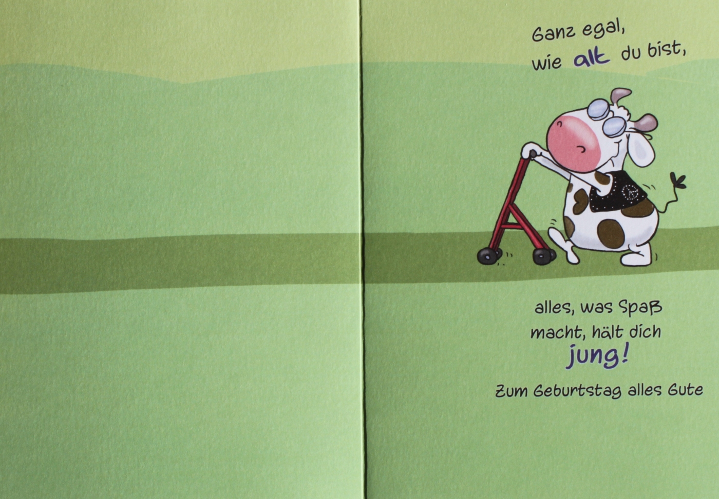 Hochwertige Karte zum Geburtstag mit lustigen Humorsprüchen auf der Kartenoberseite und Innenseite (siehe Bild 2).