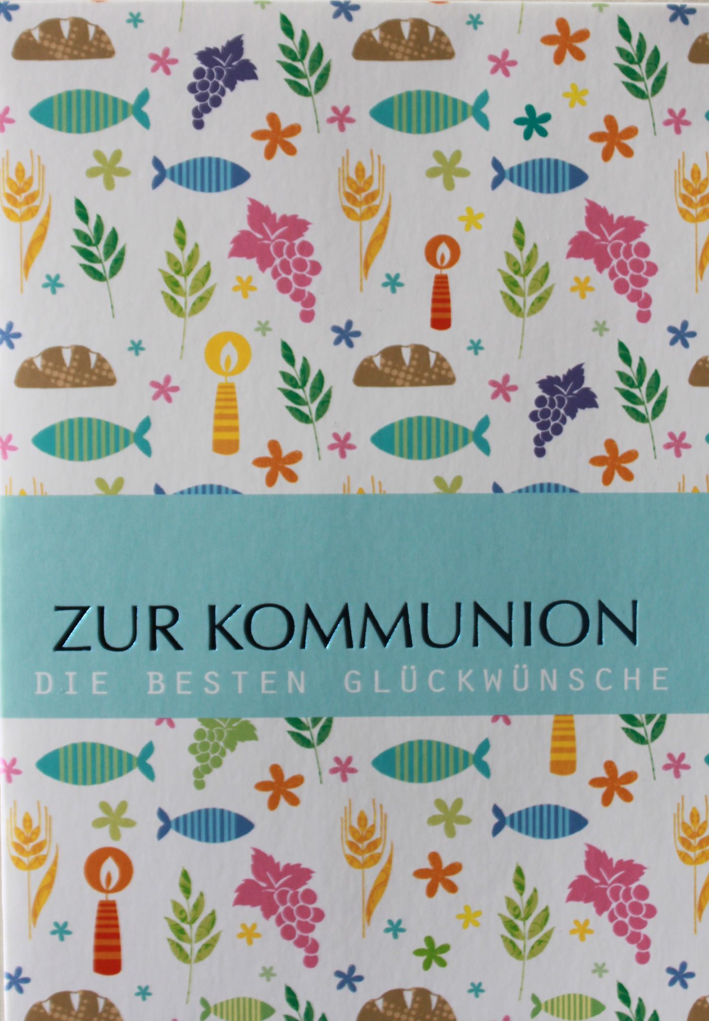 Hochwertige Kommunionskarte die mit hellblauer Heißprägefolie veredelt wurde.