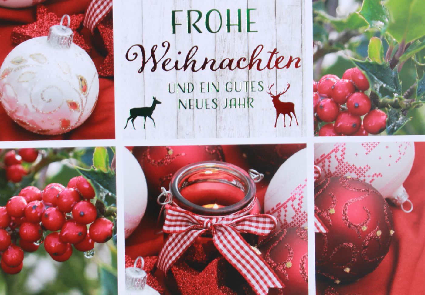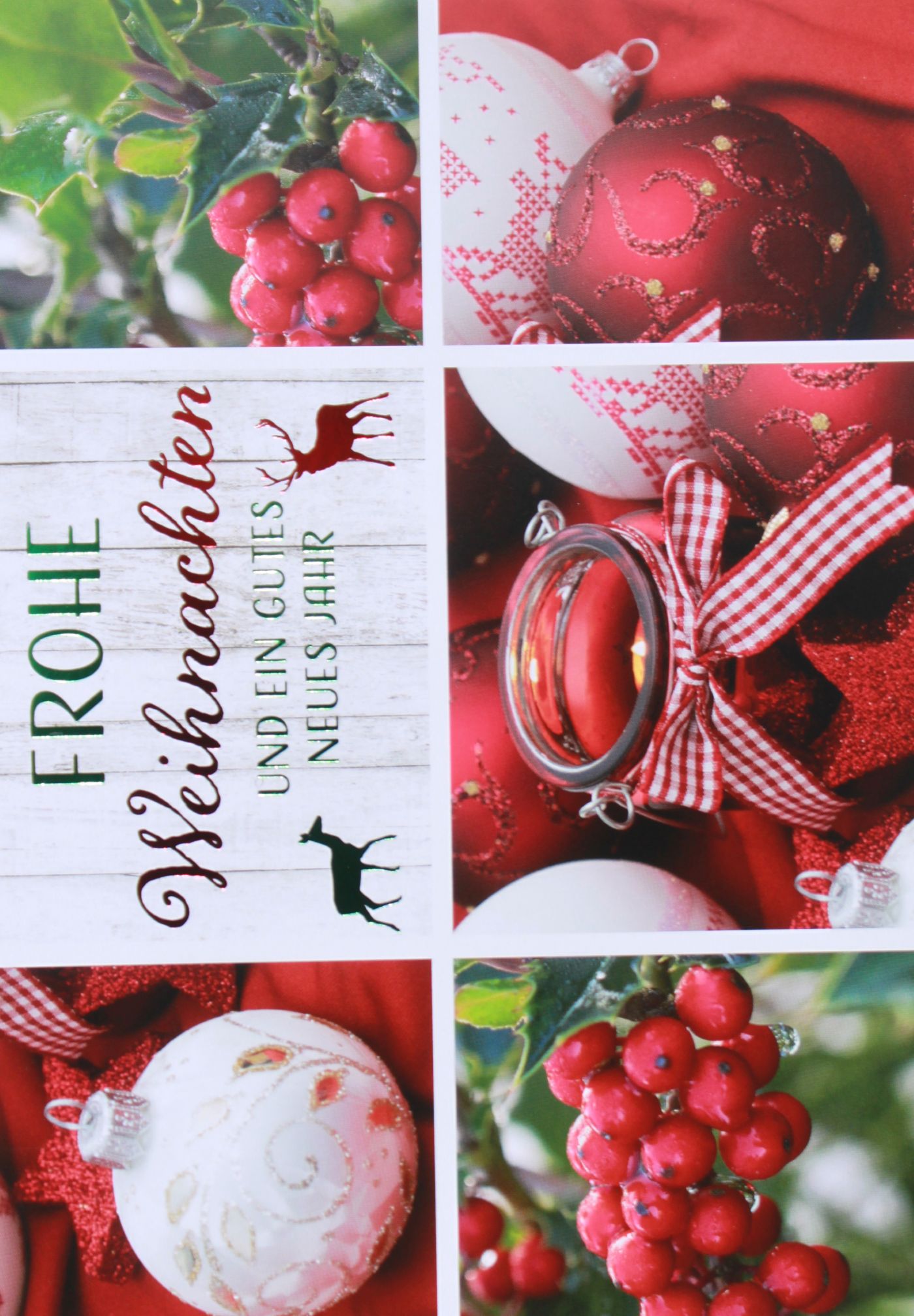 Hochwertige Weihnachtskarte die durch eine rote und grüne Heißprägefolie veredelt wurde.